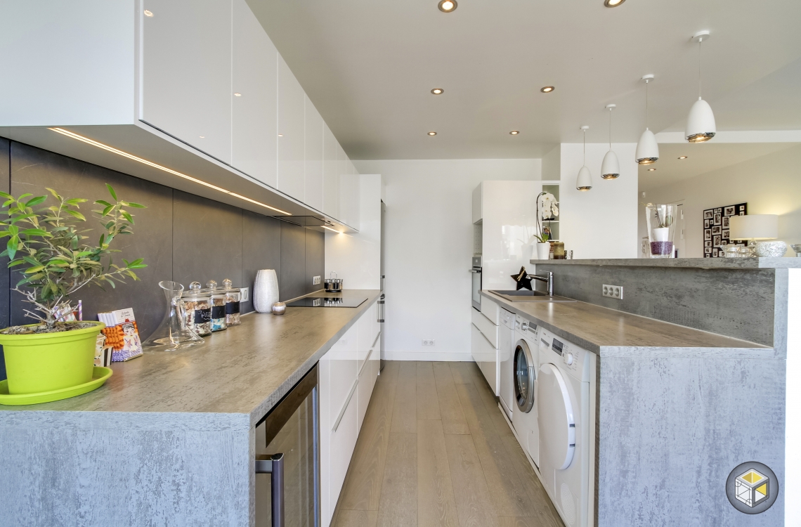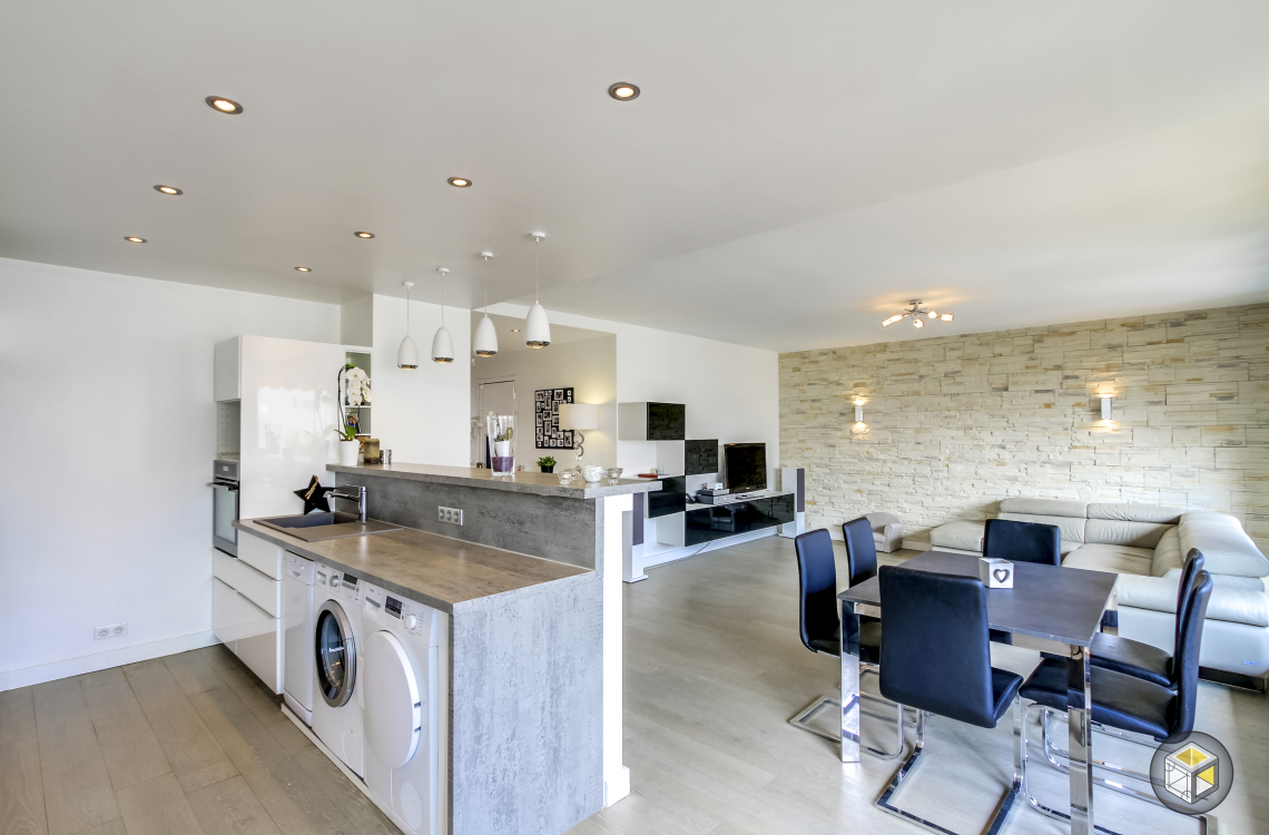 A Paris, pour la rénovation de cet appartement, Ré-novateurs a réorganisé l'espace. La cuisine a été déplacée à côté du salon, et une cloison a été enlevée pour créer une cuisine ouverte. Deux chambres d'enfants ont été aménagées dans l'ancienne cuisine et l'ancien bureau, avec la chambre parentale attenante. Pour créer du rangement, des meubles suspendus et des placards intégrés ont été installés. Dans la salle de bain, une grande douche a l'italienne remplace désormais la baignoire. Un WC suspendu a été posé. La cuisine ouverte sur le salon est délimitée par un faux plafond, dans lequel ont été intégrés des éclairages. L'un des murs du salon a été habillé de parement pour apporter une touche déco.